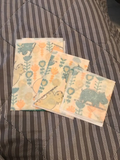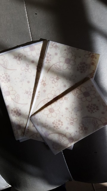 Давно присматривалась. Приятные и очень красивые, упаковка приятная и добротная, можно и на подарок покупать. В самую маленькую салфетку можно завернуть, к примеру, среднее яблоко, так что вполне функционально. Большие больше подходят для тарелок и блюд. Достаточно липкие в использовании, но руки не пачкают. Очень надеюсь,что это натуральный пчелиный воск, запаха никакого нет.