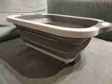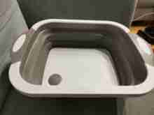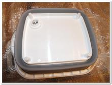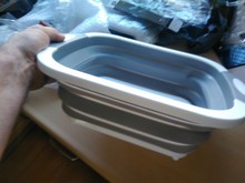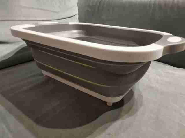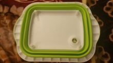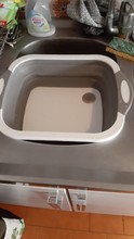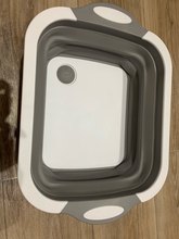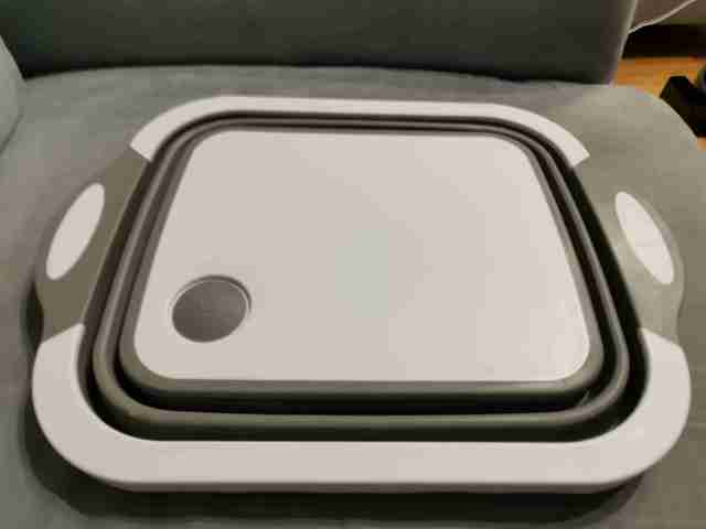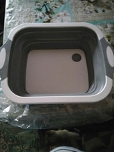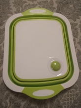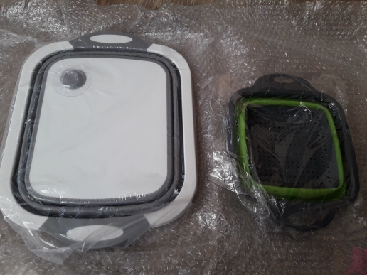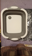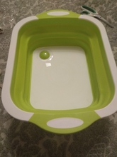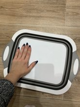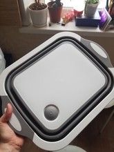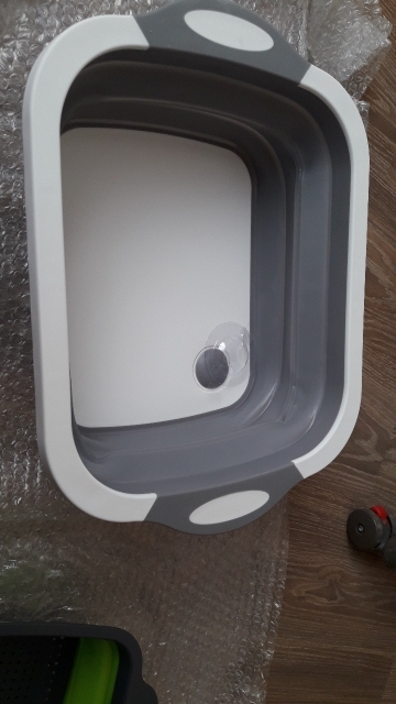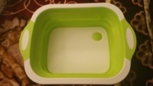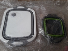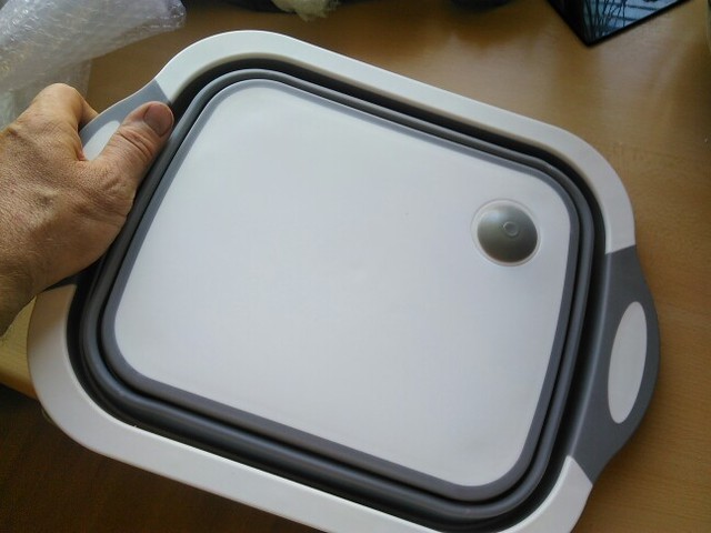 Дошло до Томска за две недели. Доска изготовлена качественно, нет зазубрин, пластмасса недешевая, прочная. Ручки обрезиненные так же как и ножки снизу, скользить не будет. Толщина пластмассы в центре 3 мм – вымерял штангельциркулем, немного, но она прочная почти не изгибается, не прорежется. На резине нет косяков, все заливочные соски аккуратно срезаны. На фото вниз расправлена не полностью там сложенная гофрой резина позволяет как бы 2 уровня глубины делать, полностью расправленная вниз дает глубину 11см. Спасибо продавцу за недорогой и удобный товар! А то достало что с досок все время на стол стекает потом вытирать запаришься.