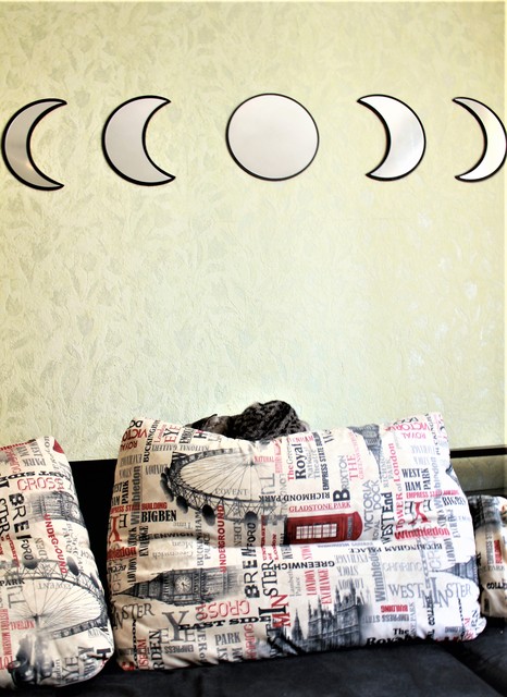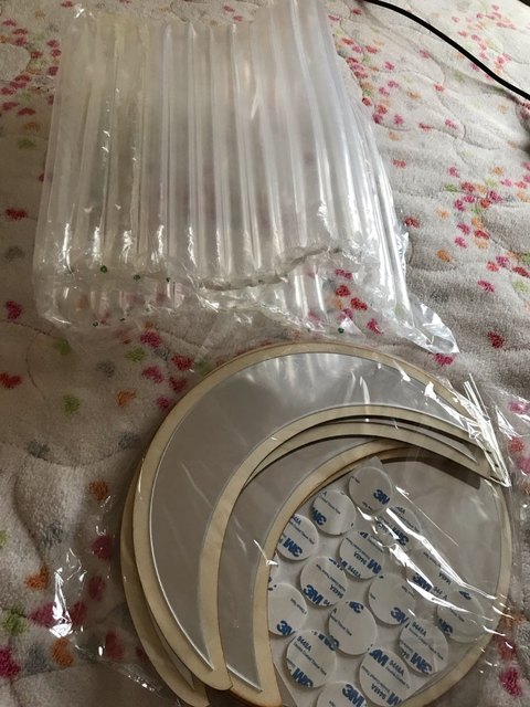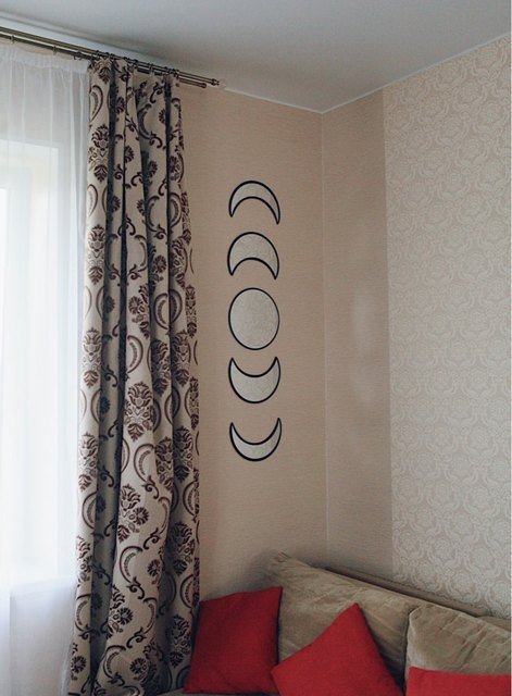 Зеркальные наклейки для декора дома. Комплект 5 штук. Можно украсить изголовье кровати, торец шкафа или детскую комнату. Наклейки деревянные. Окантовка черная. На странице продавца также варианты в светлом цвете и в других комплектациях. Зеркальная поверхность защищена пленкой. В комплекте двусторонний скотч для фиксации к любой поверхности. Приклеиваем как необходимо, снимаем верхний слой. Держатся хорошо, не падают. После приклеивания снимаем защитную пленку. Любуемся результатом. Декор смотрится оригинально. Отражение слегка преломляется, но не критично. Очень довольна результатом, рекомендовать могу.