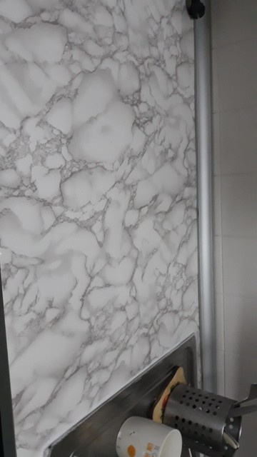 Me costo al principio colocarlo bien y sin burbujas, finalmente cogí una tarjeta y pude hacerlo perfectamente. Es necesario comprar más para cubrir toda la cocina. En general, contenta con el producto